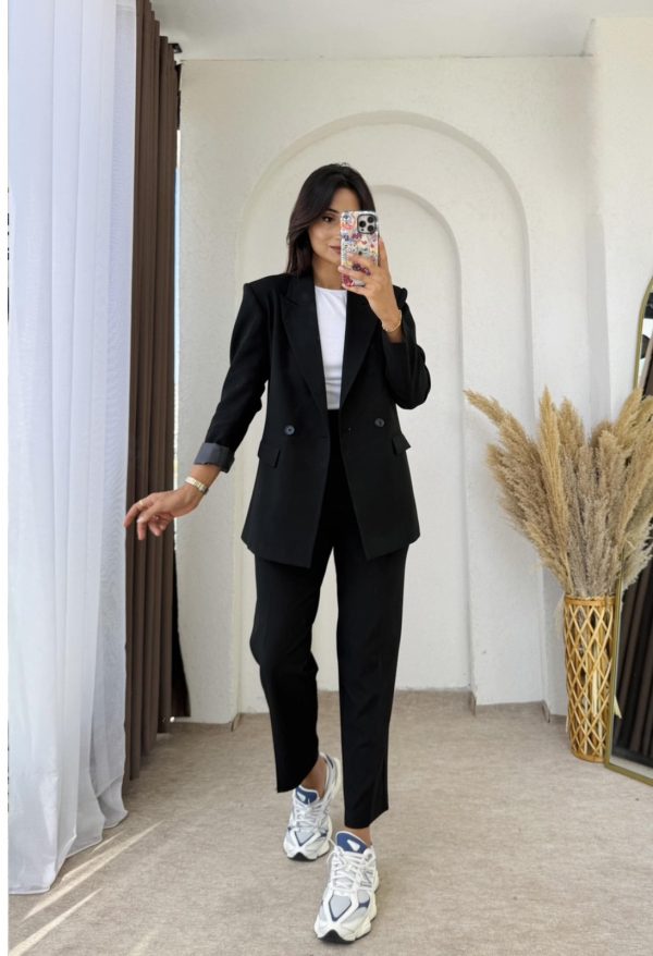 Ένα κομψό κουστούμι σε μαύρο χρώμα που συνδυάζει άνεση και στυλ. Το κοστούμι με σακάκι σε ίσια γραμμή και το άνετο παντελόνι αποπνέει διακριτική κομψότητα προσθέτουν φρεσκάδα και καθαρότητα στο σύνολο.