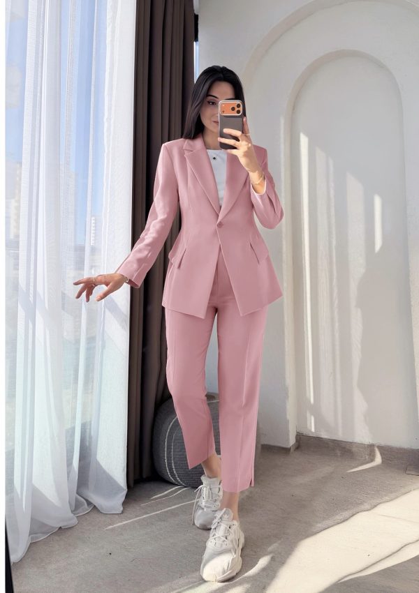 Ένα κομψό κουστούμι σε ροζ χρώμα  που συνδυάζει άνεση και στυλ. Το κοστούμι με σακάκι σε ίσια γραμμή και το άνετο παντελόνι αποπνέει διακριτική κομψότητα προσθέτουν φρεσκάδα και καθαρότητα στο σύνολο.